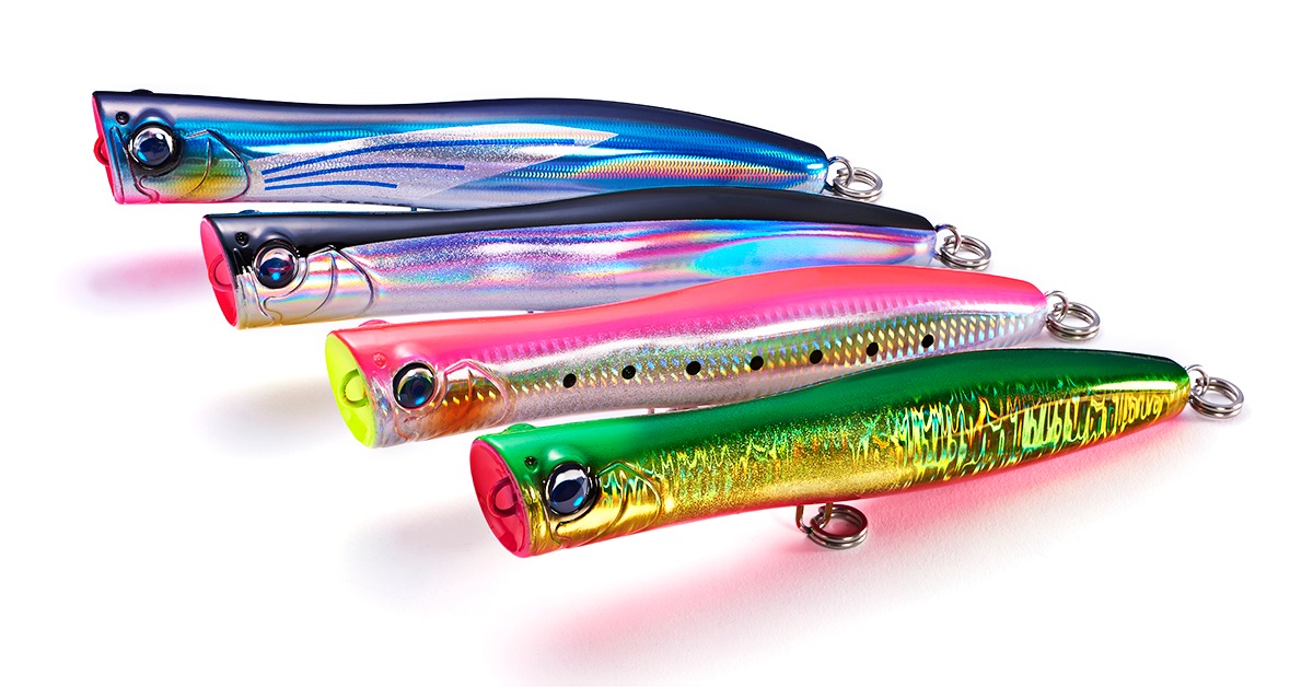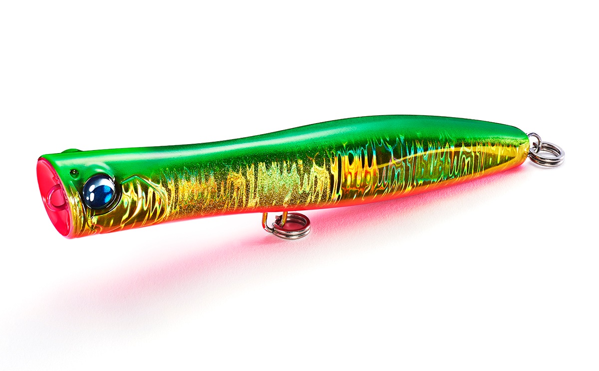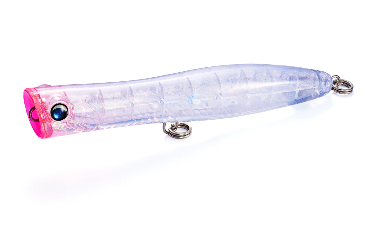カップとボディのバランスで飛距離に差が出がちのスリムポッパー。ギリギリまで大きくしたカップ形状は、飛距離を落とすことなくポッピングでの強い水押しを残し、絞ったネック部分でキャスト時の空気抵抗を小さくしています。ボディ後半の断面を四角くすることでスリムなシルエットながら大きなウエイトを積む為の浮力とフラッシング効果をアップすることができました。スリムボディでありながら、飛距離面でもアピール面でも使いやすいポッパーに仕上がっており、ポッピングからエアーカーテンを伴うロングダイブが特に得意なルアーです。
