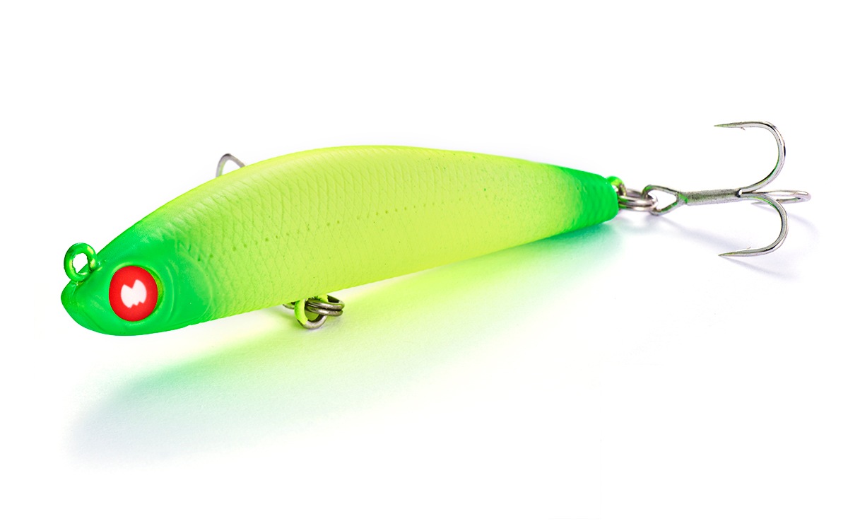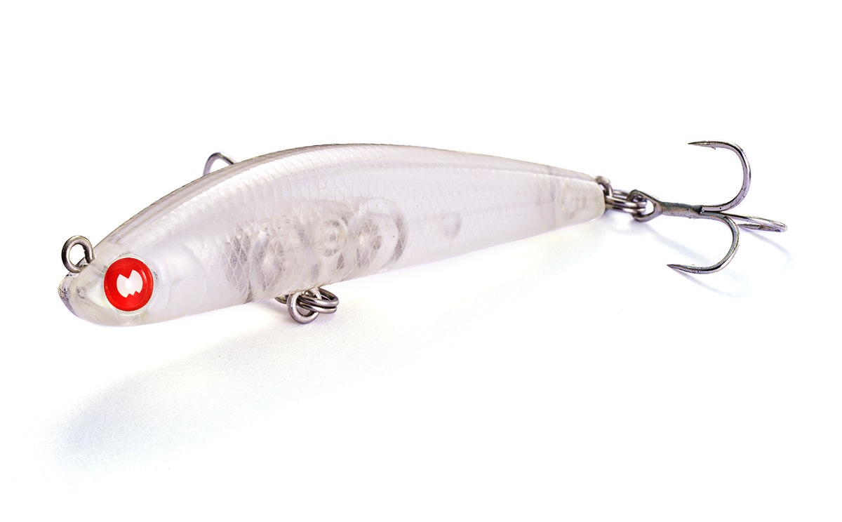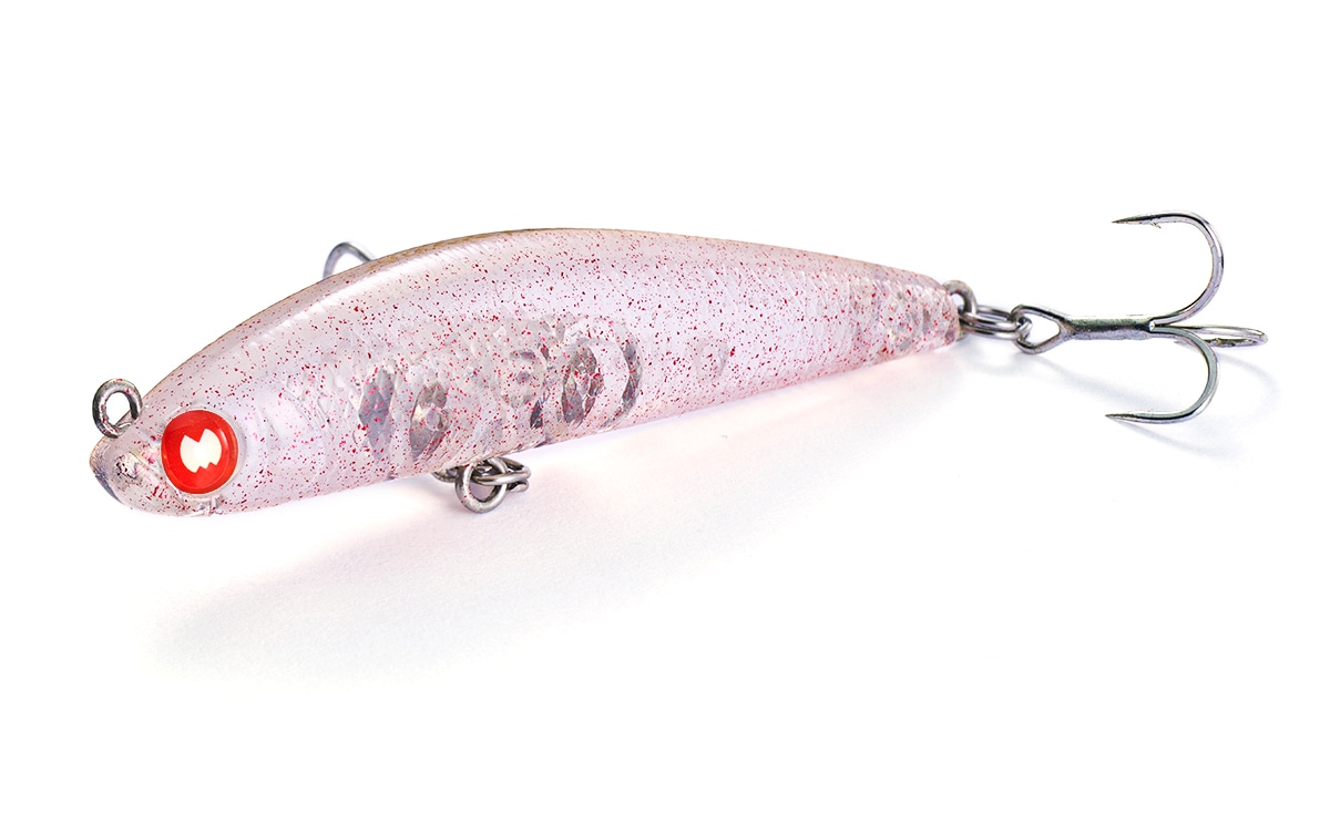 このルアーは、メバルの最も意識する表層10センチという狭いレンジをきっちりトレースするためにチューンされたペンシル系ルアー。これまで表層を攻めるルアーの代表といえばシンキングペンシルでしたが、シンキングペンシルはキャスト後、ある程度沈み込み、徐々に浮上しながら表層に到達します。その特性上、シンキングペンシルでより表層を狙うのであれば、リトリーブスピードを上げるほかありません。しかし、しっかりとスローにルアーを見せたいというジレンマが発生してしまいます。もちろん浮上するアクションに好反応を示すメバルにはこれでも十分な効果はありますが、ベイトを意識したメバルにはどうしても表層10センチを外さないルアーが必要でした。このルアーは容量ギリギリのダングステンウェイトをフロントフックの前後にふたつ配置しバランスをとることで、飛距離を出す為のウェイト量を稼ぎつつ、非常にゆっくりとした水平フォールを可能にし、キャストからリトリーブまでの間にレンジを落とすことを防いでいます。アクションはルアーの先端より後部に支点となるラインアイを設けることで、控え目なS字アクションを発生させます。引き抵抗の強いS字アクションは、通常のシンキングペンシルよりも一定レンジを引き続けることができるので、着水からピックアップまで本当の意味での表層をトレースすることができます。これにより、水面直下をこのルアーで、ひとつ下のレンジをシンキングペンシルで狙うというレンジの細分化が可能になり、メバルが何を捕食しているかなどの情報を探り出すことが可能。これは、よりシステマチックに探り分けるメバルプラッキングへのひとつの提案です。