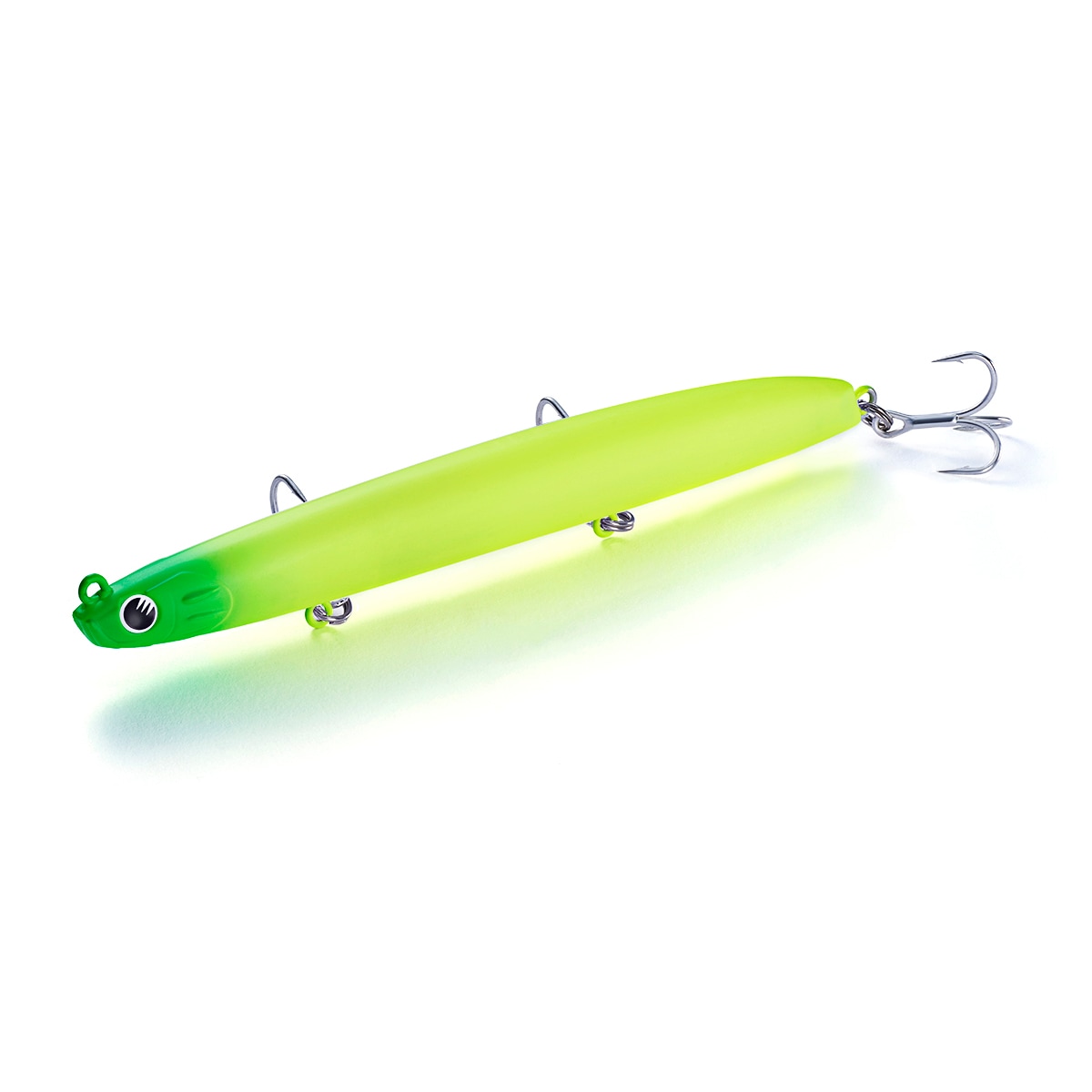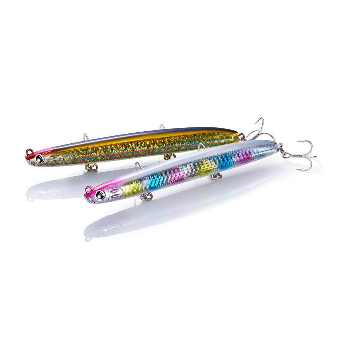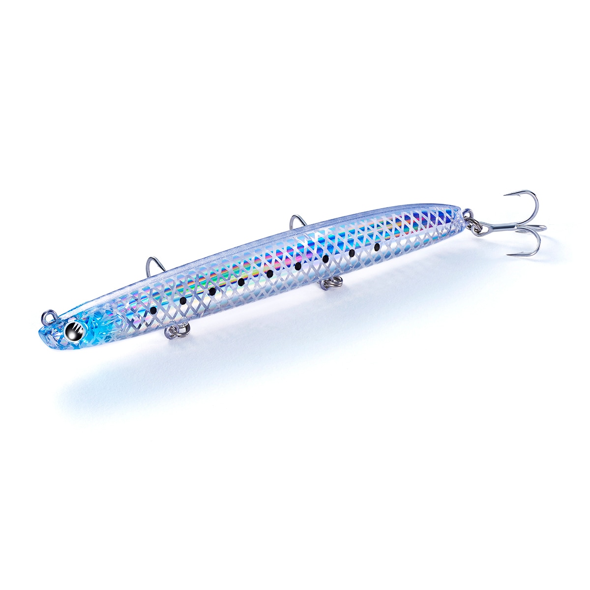 ヘッド上部に配置したアイにより、デッドスローでも弱々しいスラロームアクションを演出。流れに乗せることで、上流から流されてくるベイトを再現します。ロッドポジションとリトリーブスピードの調整により、水面直下から約30cmのレンジを自在にトレース可能。さらに、フローティングペンシルにありがちな飛距離不足を、マグネット重心移動システムとVGの搭載で解消しました。圧倒的な飛距離と素早い立ち上がりで、沖のサーフェスレンジを確実に攻略します。バチ抜け、サヨリ、マイクロベイトなど、様々なパターンに高次元でアジャストし、フィッシュイーターを魅了します。